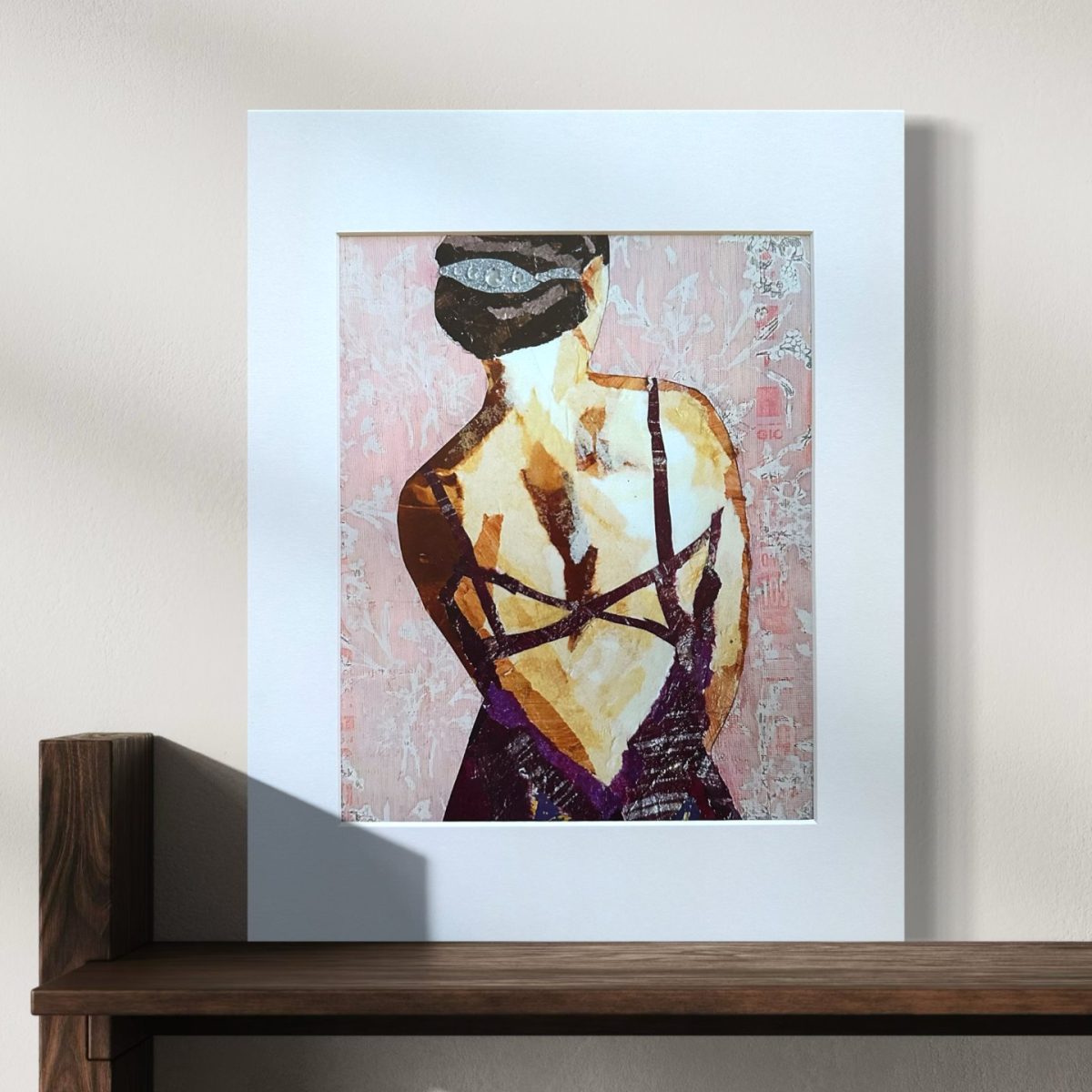 The original collage was created using layers of handmade papers, tissue papers, and cardstock, carefully arranged to build texture, movement, and depth. Rhinestone embellishments add a subtle shimmer—small moments of light that suggest confidence, adornment, and individuality.