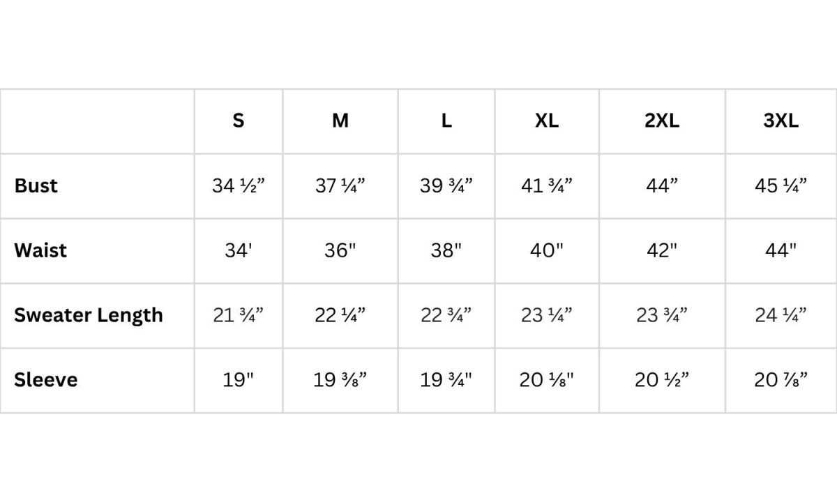 Note: Unfortunately, there were manufacturing issues with the 3XL size, so the 3XL has a bust of 45″.