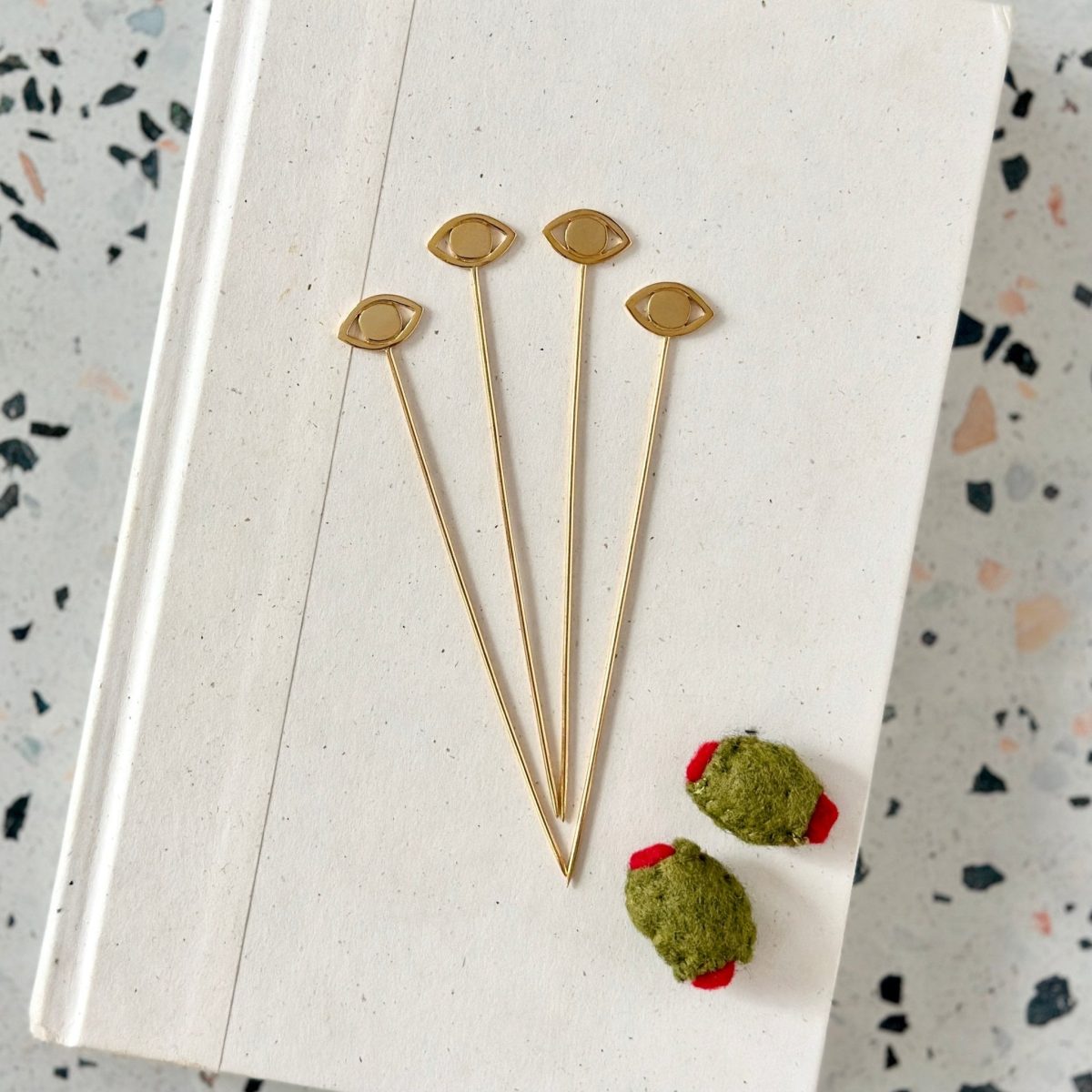 Elevate your cocktail experience with these elegant evil eye cocktail picks. Crafted from brass using the lost wax casting method, these picks are plated in 14K for a luxurious touch. Each pick measures 4 1/2″ long, making them a perfect fit for any cocktail glass.